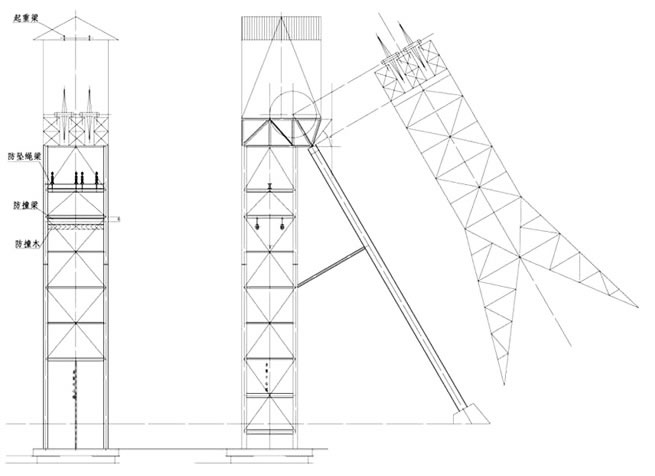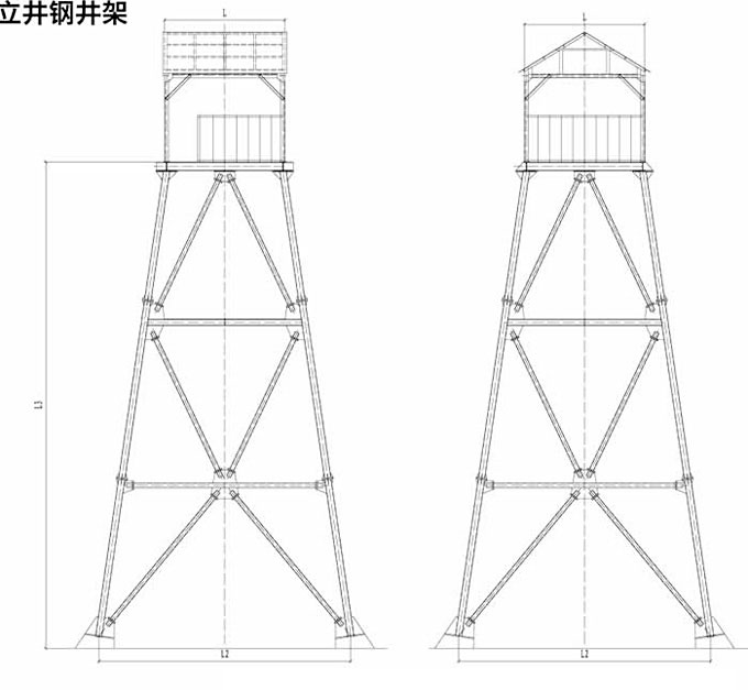 說明: 1、本型鋼井架大梁、斜撐采用厚壁鋼管。 2、各鋼管連接部分采用法蘭連接,螺栓均采用高強度螺栓,頂棚采用焊接方式。 3、井架全部采用重防腐工藝,除銹后噴鋅,再噴重防腐面漆兩遍。 立井鋼井架特征說明 以上所列立井鑿井井架均為鋼管井架,包括五個型號共七種。本井架系列可滿足井徑3.5~8.0cm,井深200~1000m的立井井筒施工及其工藝要求,其中V型井架更適用于采用大型機械化配套設(shè)備的深井施工。